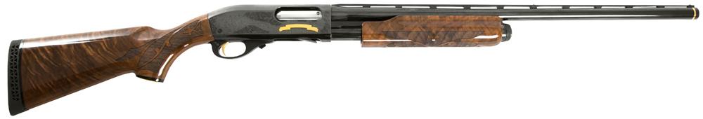 The Remington Firearms 870 Wingmaster 200th Anniversary pump shotgun has a standard trigger, crossbolt safety, and a 26″ barrel. The matte black receiver is chambered for 3″ 12-gauge shells with a 4 1 capacity. Along with an C-grade walnut wood stock, the 870 has a vent rib barrel with twin bead sights.